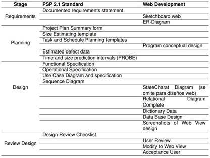 Table 4 illustrates the designated preparation points for the deliverables based on the chosen PSP version. Furthermore, in Table 5, a correlation is observed with the previous table, categorizing the deliverables added to ensure functionality in Web development and uphold its quality, positioned on the right side of the table.