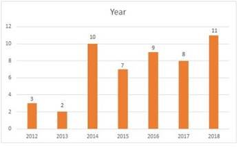 While querying our topic, over 160 papers were identified, but the search was confined to the past seven years. Figure-5 illustrates the distribution over the years, revealing a relatively low volume of research in 2012-2013, followed by a noticeable increase from 2014 onwards. The data indicates two peak years for publications, with 11 papers in 2018 and 10 papers in 2014.
