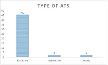 As previously mentioned, there are two types of ATS based on output type: Extractive Text Summarization and Abstractive Text Summarization. Additionally, a "Hybrid" category was introduced for papers employing a combination of Text Summarization techniques. Classification based on these types reveals that among the papers, 46 fall under the Extractive type, 2 under Abstractive, and 2 under Hybrid (see Figure 6).