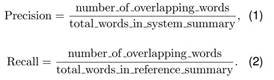 In the context of ROUGE, Precision assesses the extent to which the ATS summary is truly relevant or necessary. On the other hand, Recall evaluates how much of the reference summary the ATS summary is able to retrieve or capture.